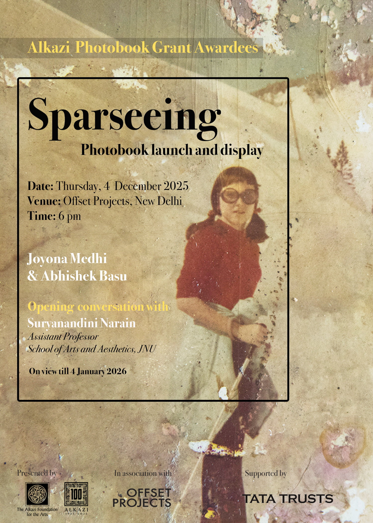 The Alkazi Foundation for the Arts is happy to announce the photobook launch and (travelling) archival exhibit of Sparseeing, a collaborative work by the winners of the 2022 Alkazi Photobook Grant: Joyona Medhi and Abhishek Basu.